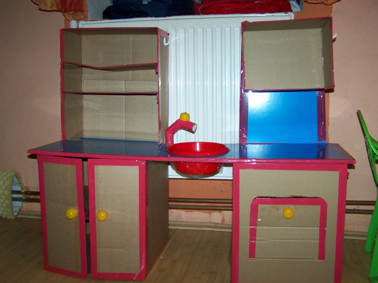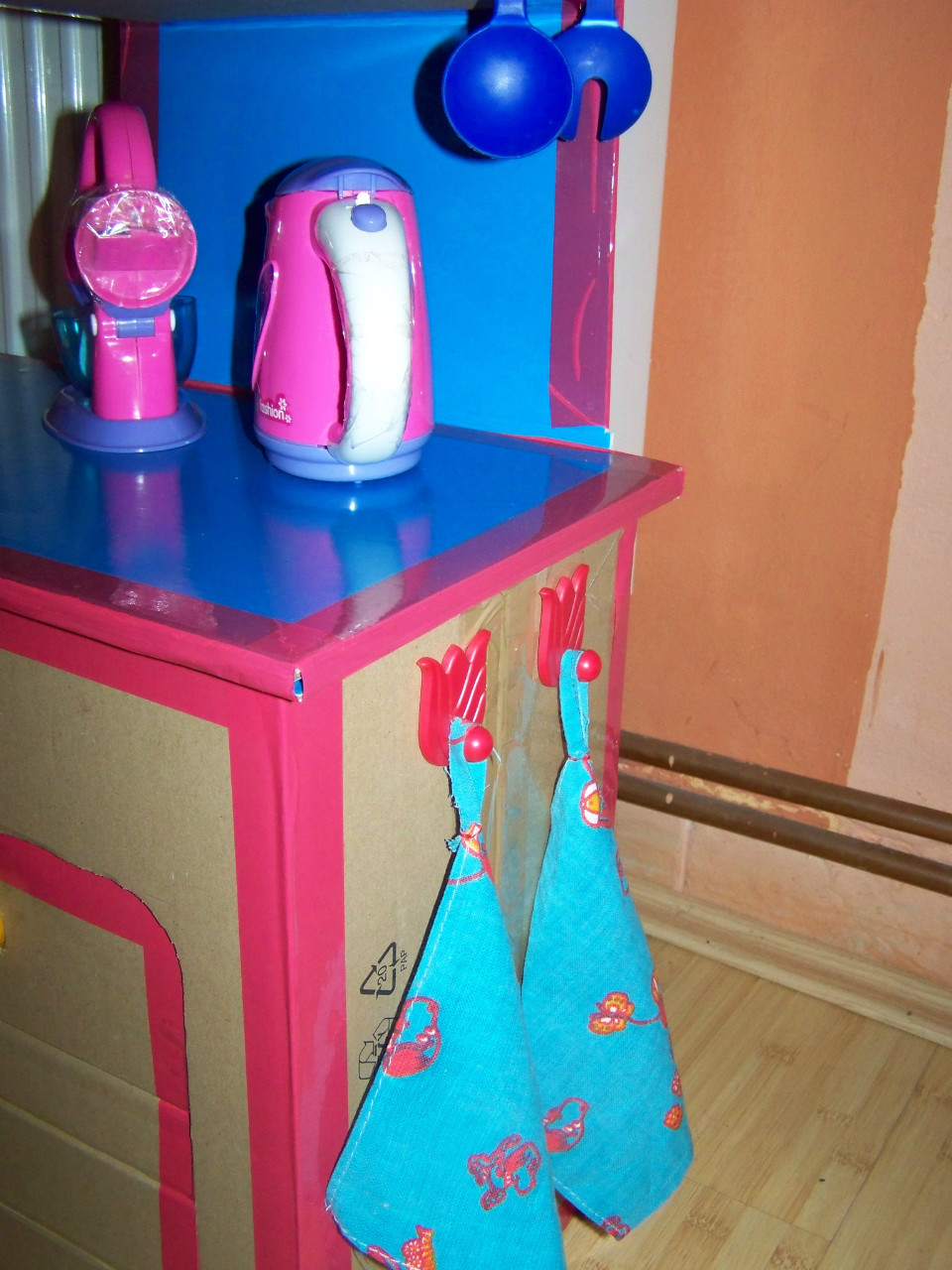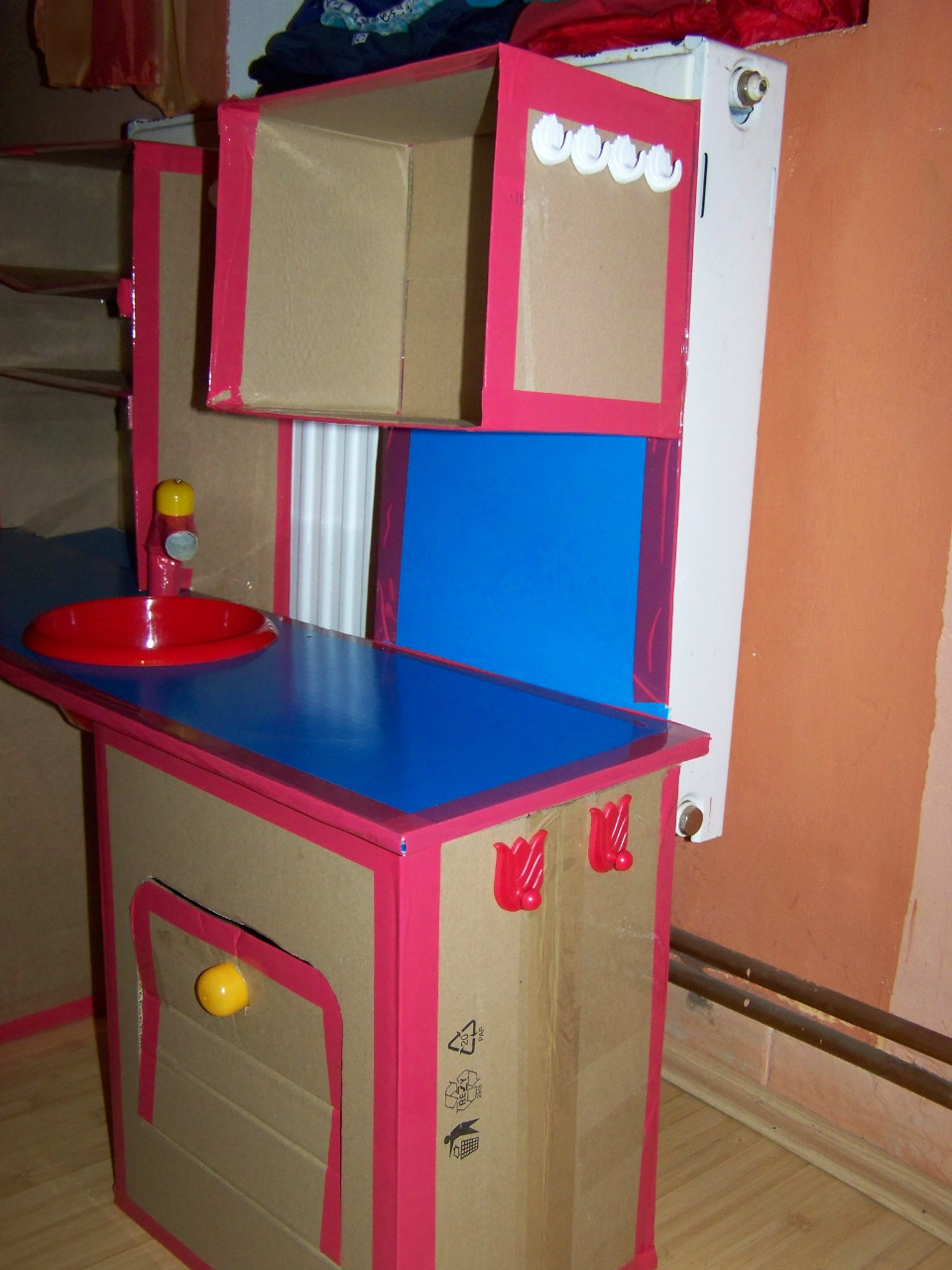 Pro své děti jsem vyrobila kuchyňku z kartonu. Nechtělo se mi investovat do plastového výrobku, který by mé děti bavil chvíli a pak by jen zabíral místo. Papírového modelu se zbavíte lépe. Hrany jsem olemovala červenou lepící páskou a dokoupila plastové háčky. Umyvadlo je z plastové misky doplněné upravenou papírovou trubkou s "kohoutkem" z Kinder vejce. Z vajíčka jsou i úchytky trouby a skříňky vlevo. Pak už stačí jen dovybavit nádobíčkem.