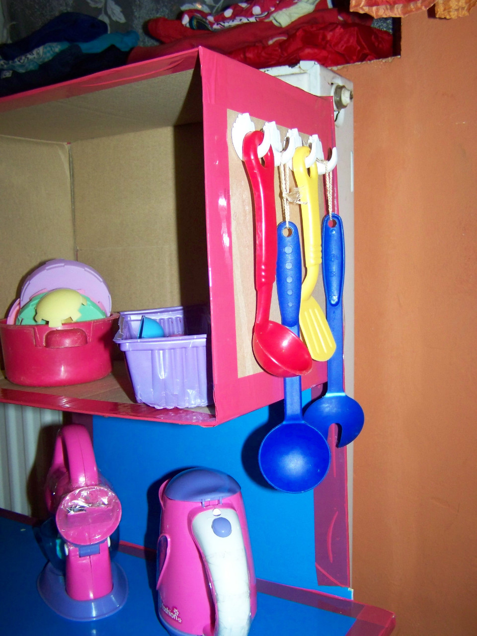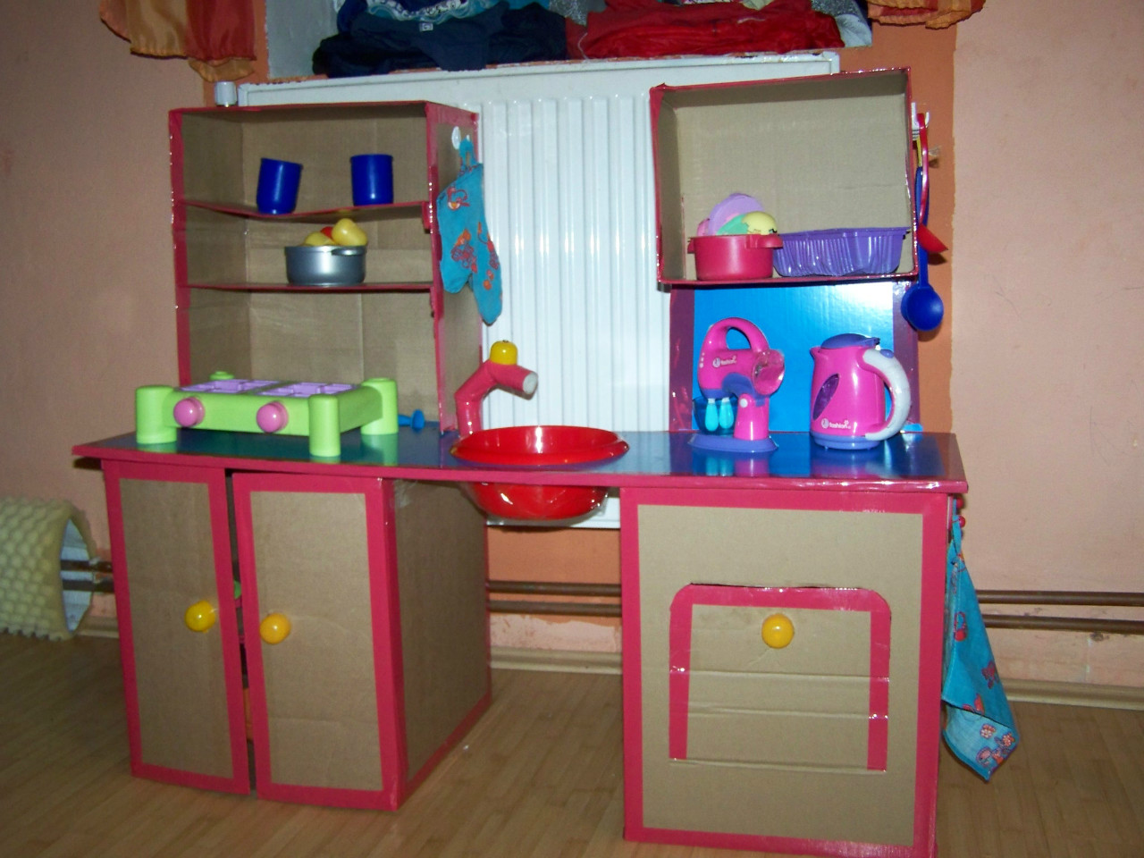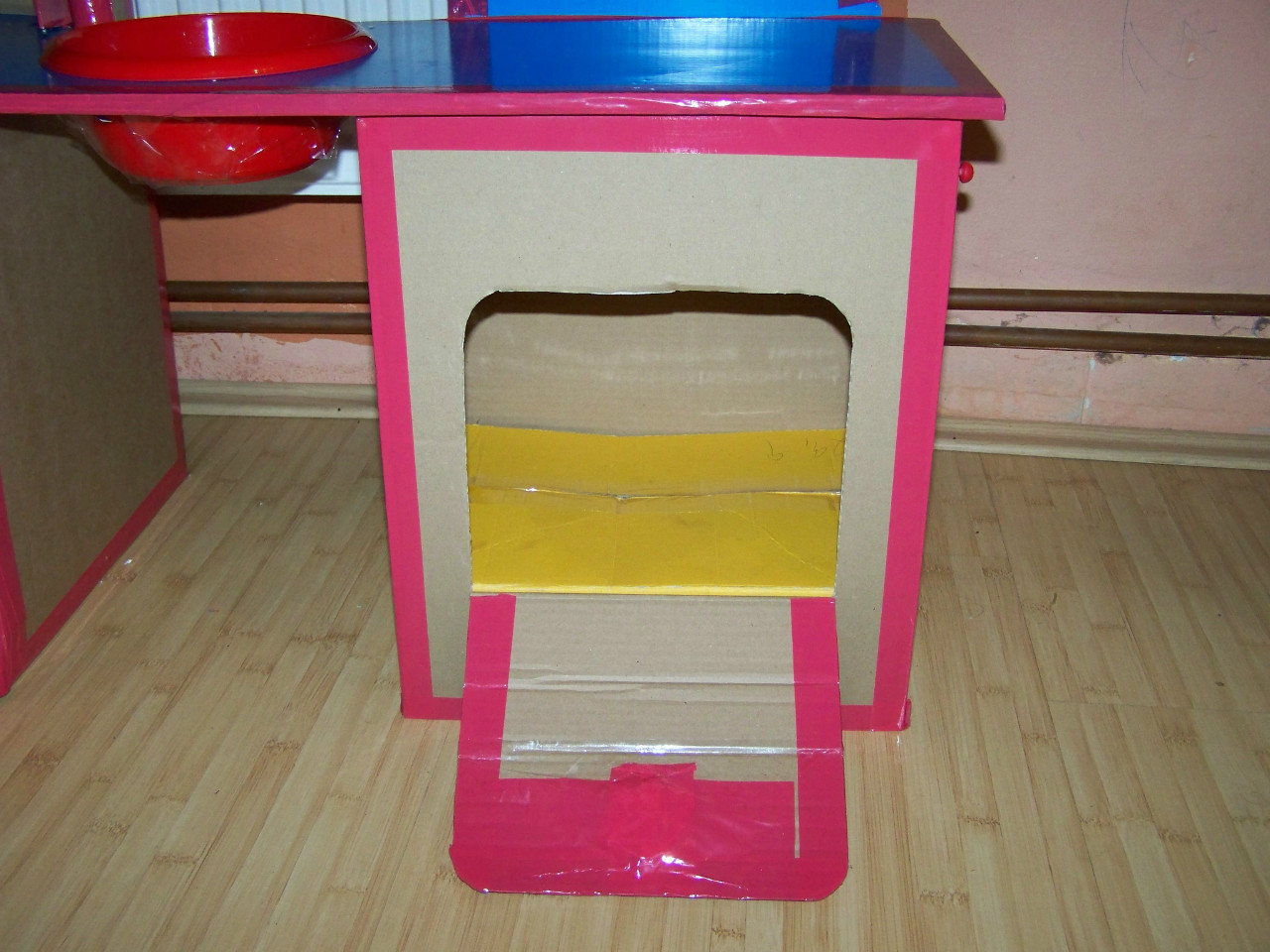 Pro své děti jsem vyrobila kuchyňku z kartonu. Nechtělo se mi investovat do plastového výrobku, který by mé děti bavil chvíli a pak by jen zabíral místo. Papírového modelu se zbavíte lépe. Hrany jsem olemovala červenou lepící páskou a dokoupila plastové háčky. Umyvadlo je z plastové misky doplněné upravenou papírovou trubkou s "kohoutkem" z Kinder vejce. Z vajíčka jsou i úchytky trouby a skříňky vlevo. Pak už stačí jen dovybavit nádobíčkem.